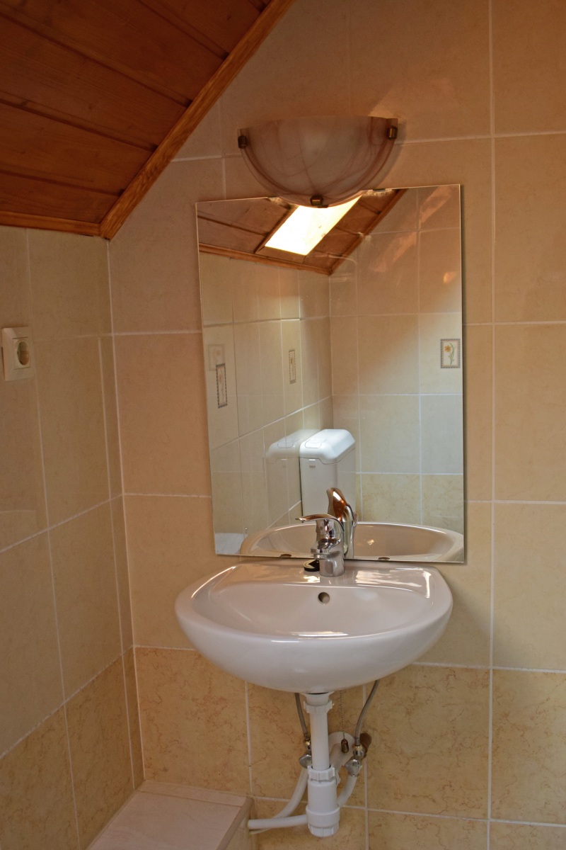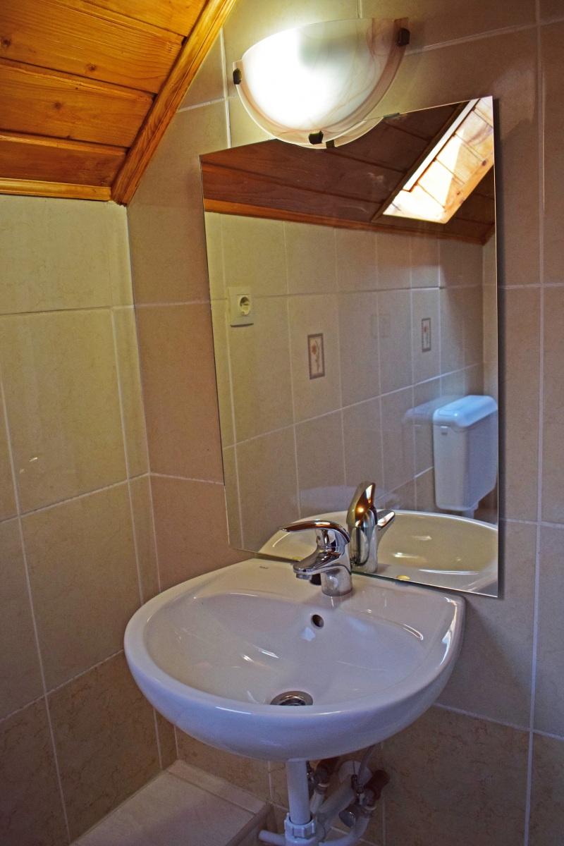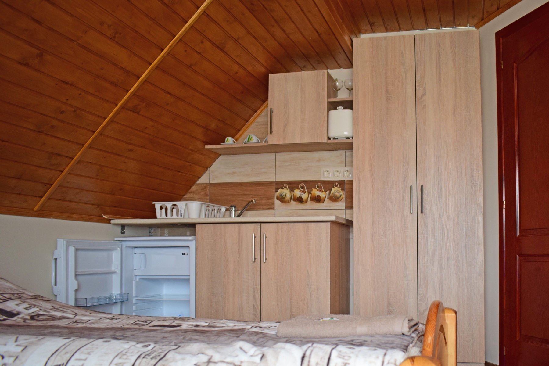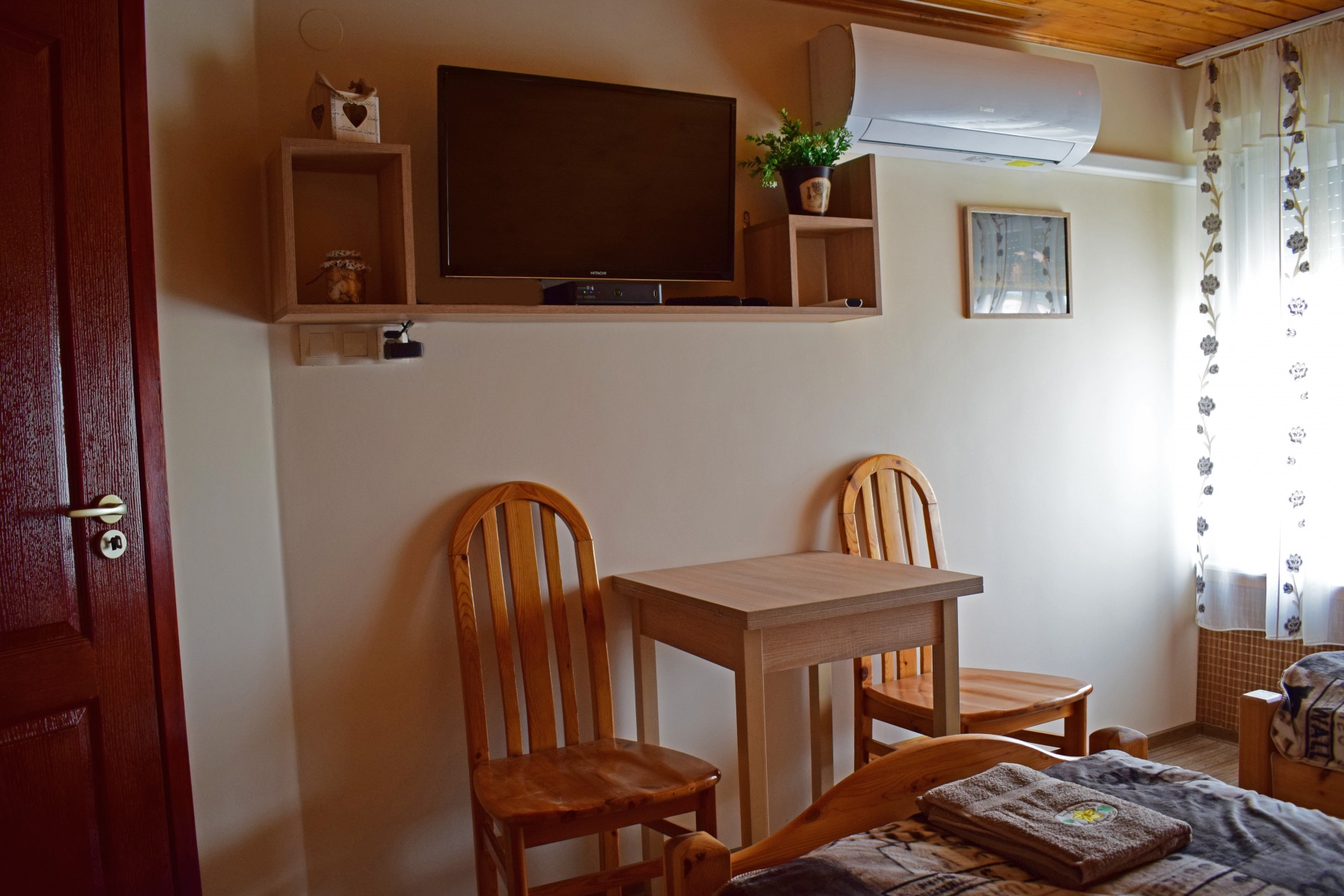 Tetőtéri klimatizált apartman, egy légtérben található a konyhasarok és a hálótér, ebből nyílik a zuhanyzós fürdőszoba. 2 fő részére. A konyhasarok (edényekkel, étkészlettel, kávéfőző, mikrohullámú sütő,elektromos főzőlap,mosogatóval, hűtőszekrénnyel felszerelve) A szobában 2 db egyszemélyes ágy (összetolható), étkezőasztal székkel, 80 cm LED-es TV T-home IP-TV-vel található.